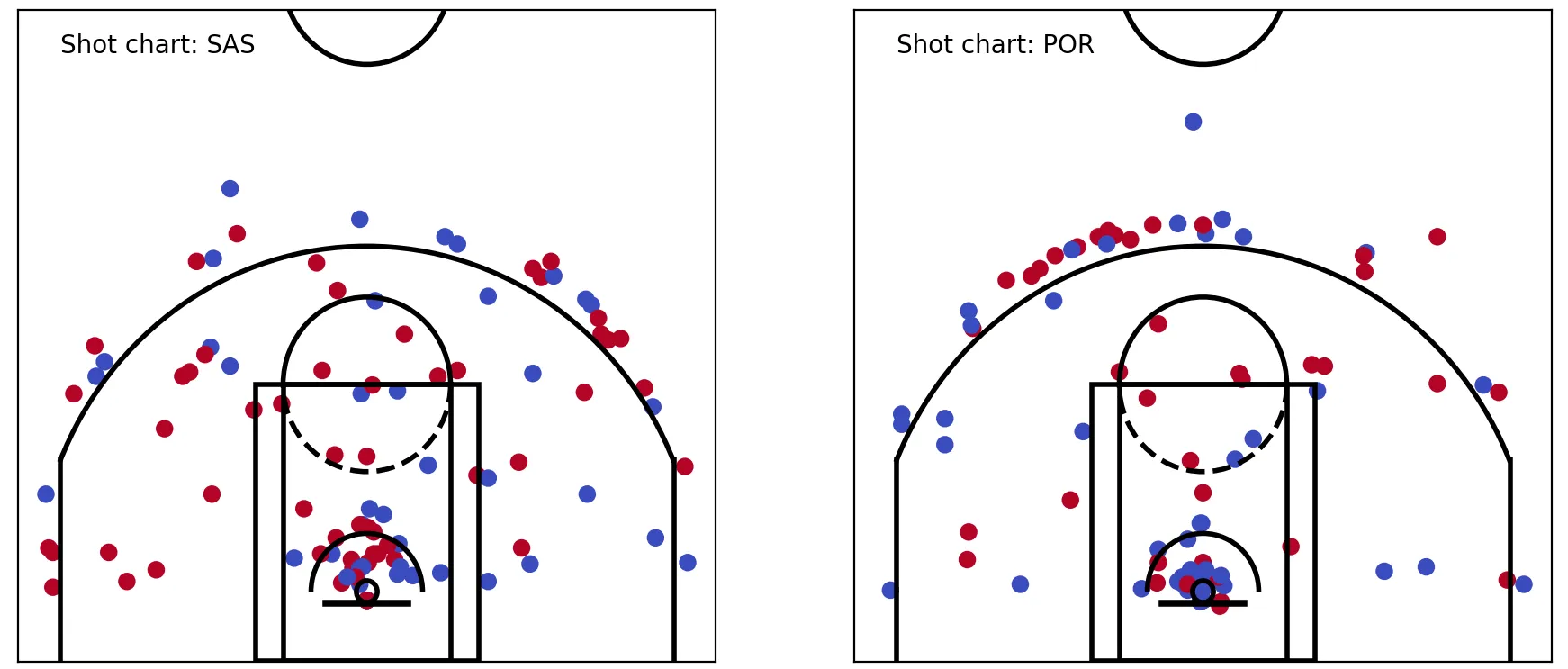 Looking at the ‘team’ column with print(shots_df.team.unique()), shows ‘SAS’ and ‘POR’ as the only two values, so we can filter by those. For instance, we can get San Antonio’s shots by:
