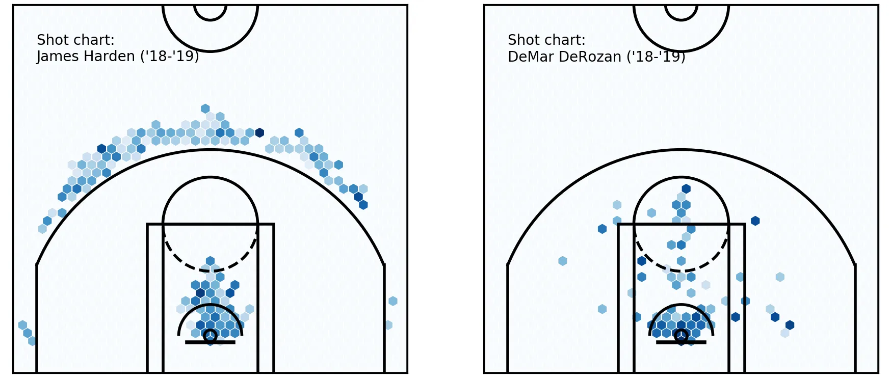 It can be better, but we already see a great improvement over our earlier plots. These players could hardly be different — could they? DeRozan’s bread and butter really is in the midrange, and around the rim, where Harden’s shot chart is basically empty there, especially after filtering.