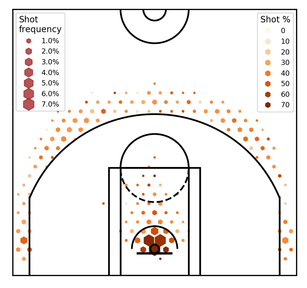 Using hexbins, we could divide up the basketball court to ‘bins’. And we can present more information this way — remember Kirk Goldsberry’s charts that we looked at in my previous post? Here’s another one.