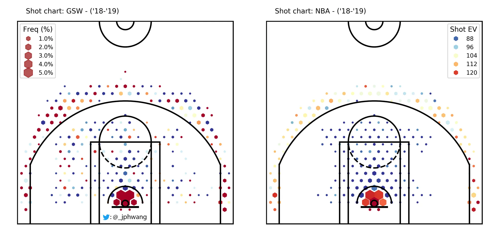 In these charts, each hexagon represents the x-coordinate area, y-coordinate area, and the average shot accuracy for all shots taken in that hexagon. It is said to encode three dimensions of information.